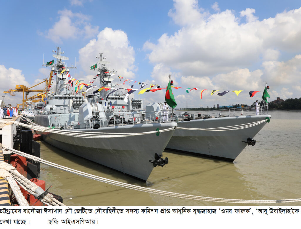 বাংলাদেশের জলসীমা সুরক্ষায় নৌবাহিনীর সক্ষমতা বৃদ্ধি করতে নৌবহরে সংযোজিত হলো নতুন দুইটি আধুনিক ফ্রিগেট বানৌজা ‘ওমর ফারুক’, ‘আবু উবাইদাহ’ ও একটি করভেট যুদ্ধজাহাজ ‘প্রত্যাশা’ এবং দুইটি জরিপ জাহাজ বানৌজা ‘দর্শক’ ও ‘তল্লাশী’। মাননীয় প্রধানমন্ত্রী শেখ হাসিনা বৃহস্পতিবার ( ৫ নভেম্বর ) গণভবন থেকে ভিডিও টেলিকনফারেন্স (ভিটিসি) এর মাধ্যমে জাহাজসমূহকে নৌবাহিনীতে কমিশনিং করেন। এরমধ্য দিয়ে যুদ্ধজাহাজসমূহ নৌবাহিনীতে আনুষ্ঠানিকভাবে অপারেশনাল কার্যক্রম শুরু করলো। এর আগে চট্টগ্রামে বানৌজা ঈসাখান নৌ জেটিতে মাননীয় প্রধানমন্ত্রীর পক্ষে নৌবাহিনী প্রধান এডমিরাল এম শাহীন ইকবাল জাহাজসমূহের অধিনায়কগণের হাতে কমিশনিং ফরমান তুলে দেন এবং নৌবাহিনীর রীতি অনুযায়ী আনুষ্ঠানিকভাবে নাম ফলক উন্মোচন করেন।বাংলাদেশ প্রতিরক্ষা মন্ত্রণালয়ের আন্তঃবাহিনী জনসংযোগ পরিদপ্তর (আইএসপিআর)এর সহকারী পরিচালক মোহাম্মদ রেজাউল করিম শাম্মী স্বাক্ষরিত এক প্রেস বিজ্ঞপ্তিতে এ সংবাদ জানানো হয়।