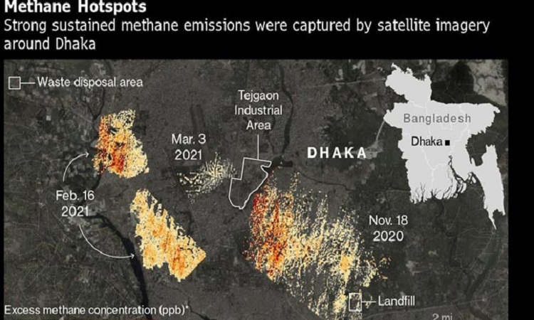 গত ২৫ এপ্রিল জিএইচজিস্যাট ইনকরপোরেশনের বরাত দিয়ে প্রভাবশালী গণমাধ্যম ব্লুমবার্গে একটি প্রতিবেদন প্রকাশিত হয়। ওই প্রতিবেদটিতে উল্লেখ করা হয়, স্যাটেলাইটের মাধ্যমে বাংলাদেশের রাজধানী ঢাকার কোনো এক অংশ থেকে পৃথিবীর উষ্ণতা বৃদ্ধিতে সবচেয়ে ক্ষতিকর ভূমিকা রাখা গ্রিনহাউজ গ্যাসগুলোর মধ্যে অন্যতম মিথেন গ্যাসের বিপুল পরিমাণ নিঃসরণ চিহ্নিত করা হয়েছে। অর্থাৎ রাজধানী ঢাকারই কোনো একটি অংশ থেকে প্রচুর পরিমাণে বিষাক্ত মিথেন গ্যাস উৎপন্ন হচ্ছে।