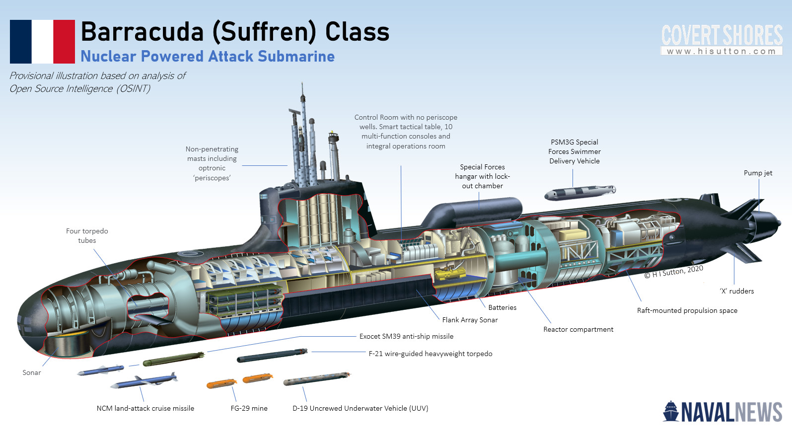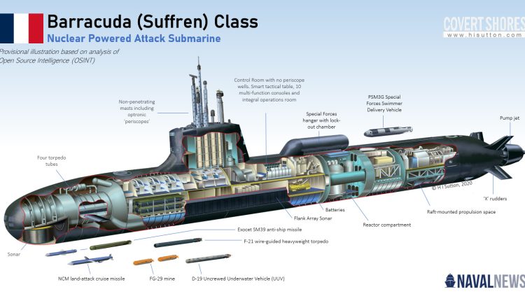 নিউক্লিয়ার পাওয়ারড সাবমেরিন তৈরির ক্ষেত্রে রাশিয়া, আমেরিকা ও যুক্তরাজ্যের পাশাপাশি ফ্রান্সও কিন্তু বেশ ভালো মানের ও নিজস্ব উচ্চ প্রযুক্তির নিউক সাবমেরিন ডিজাইন ও তৈরি করে। বিশেষ করে ফ্রান্সের শীপ বিল্ডিং কর্পোরেশন ফ্রেঞ্চ শীপ বিল্ডার ‘নেভাল গ্রুপ’ সাবমেরিন তৈরির জন্য একটি বিখ্যাত প্রতিষ্ঠান। ফ্রান্সের নেভাল গ্রুপের তৈরি ‘সাফরেন’ কার্যত হচ্ছে একটি ফরাসী বারকুডা ক্লাসের উচ্চ প্রযুক্তি নির্ভর আধুনিক নিউক্লিয়ার পাওয়ারড ফাস্ট এ্যাটাক সাবমেরিন। আর ফরাসী নেভীতে এটি হচ্ছে এই ক্লাসের প্রথম কোন সাবমেরিন। অদূর ভবিষ্যতে ফ্রান্স এরুপ মোট ৬টি বারকুডা ক্লাস নিউক ফাস্ট এ্যাটাক সাবমেরিন পর্যায়ক্রমে সার্ভিসে আনবে। যা হোক বারকুডা ক্লাসের ‘সাফরেন’ নিউক সাবমেরিনটি ৬ই নভেম্বর ২০২০ সালে কমিশনিং লাভ করলেও সকল পরীক্ষা শেষে ফ্রান্সের নৌবাহিনী কার্যত চলতি ২০২২ সালের ৩রা জুন পূর্ণাঙ্গভাবে নেভাল ব্যাটল গ্রুপে সার্ভিসে আনে। যদিও ফ্রান্স এ প্রজক্ট নিয়ে কাজ শুরু করে ২০০৭ সালে।